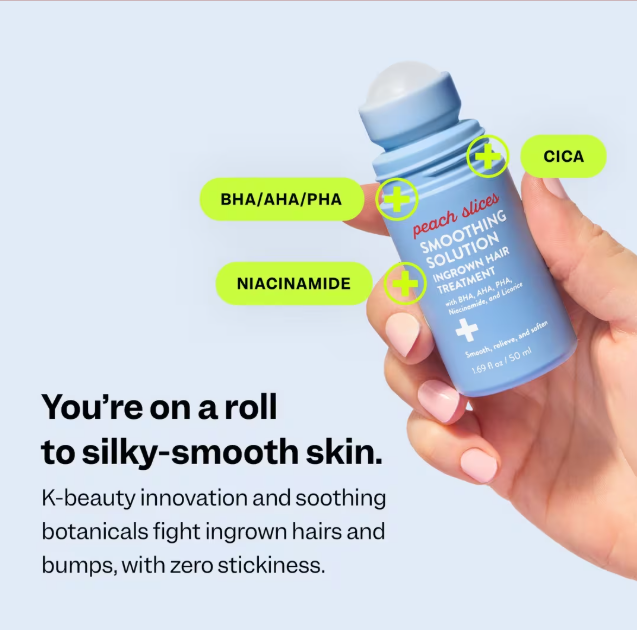 Peach Slices Smoothing Solution Ingrown Hair Treatment visibly improves bumps, redness, and ingrown hairs with an easy-to-use roller. BHA gently exfoliates, niacinamide and licorice brighten, and cica and perilla soothe for smooth, soft skin. Absorbs quickly with no mess. Ingrown hairs, you’re out.